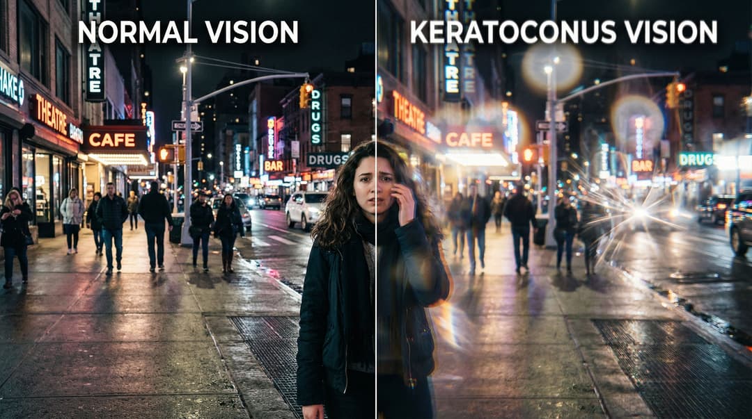 Many people with keratoconus notice that oncoming headlights, wet roads, and low contrast make night driving stressful.